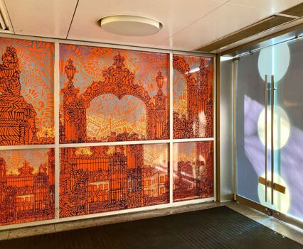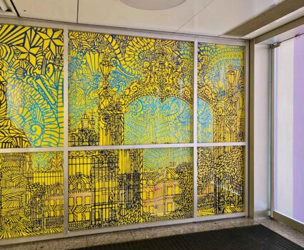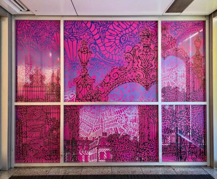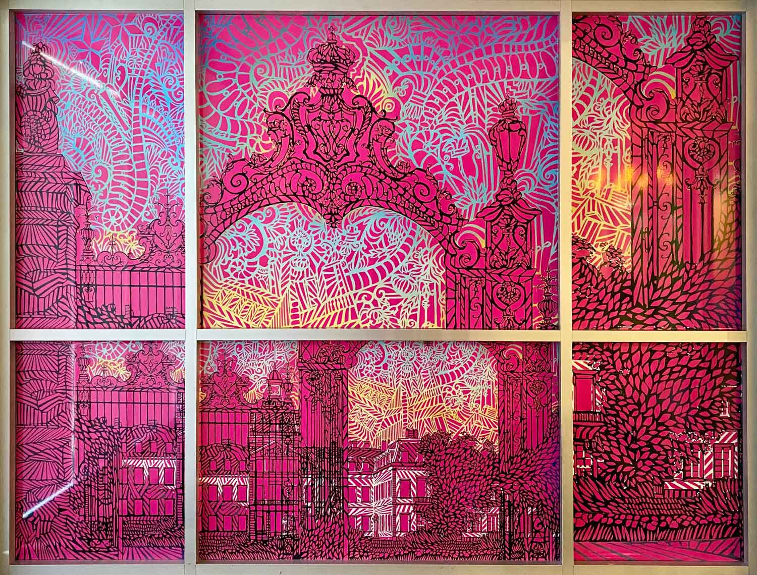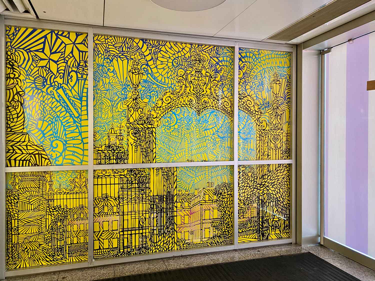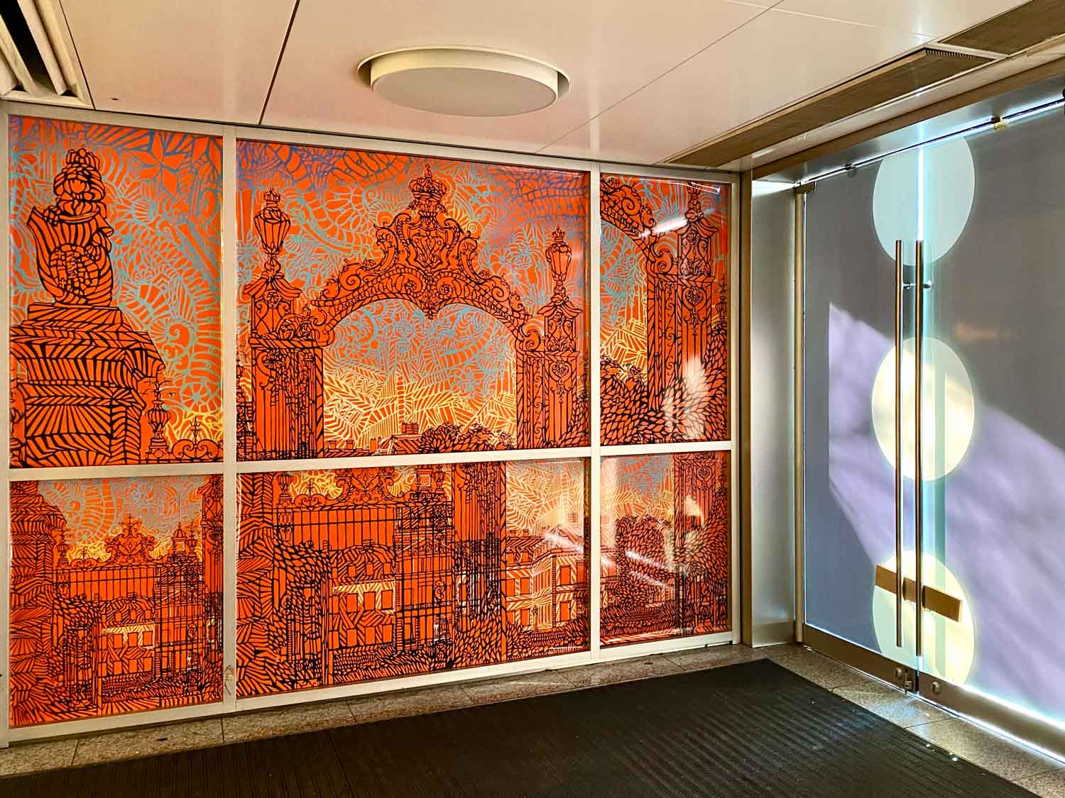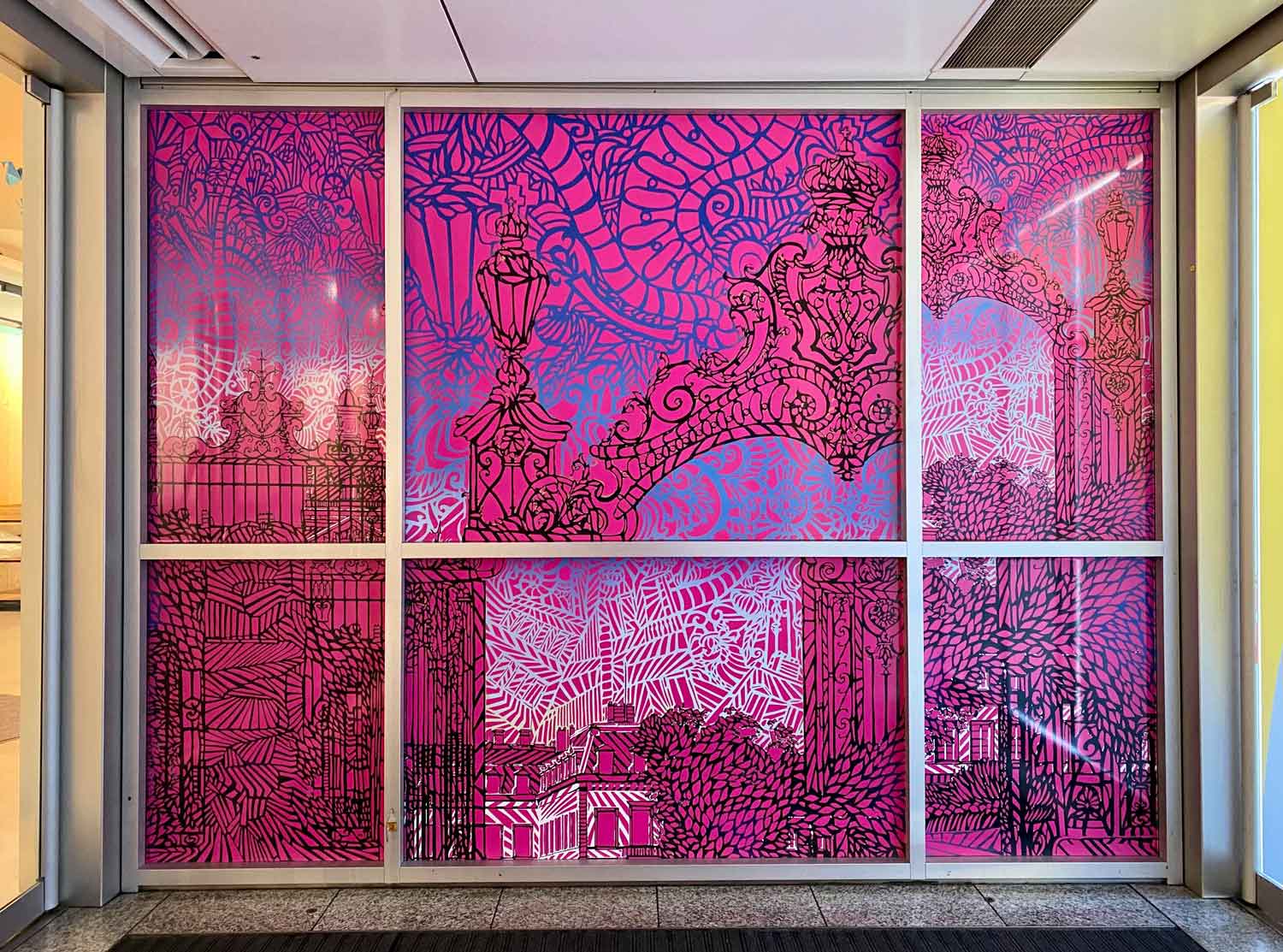 Die Cutouts sind sehr detailliert und filigran geschnitten. Im nächsten Schritt habe ich aus dem ursprünglichen Cutout einzelne Segmente herausgelöst, und für die 6 Glasfelder im Eingang des Stadthofes zu einer neuen Wandinstallation komponiert. Jede der 3 Eingänge: Salzstraße, Mitte und Nürnberger Straße zeigen unterschiedliche Varianten des gleichen Bildes in unterschiedlicher Farbgebung.